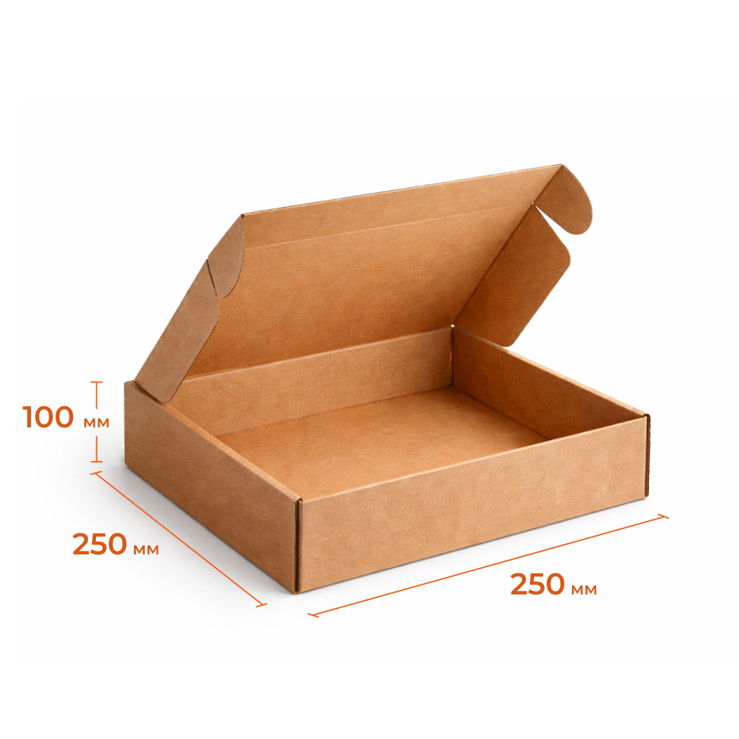 Короб с ушками размером 250х250х100 мм, изготовленный из бурого картона Т23В. Этот самосборный короб с прочной конструкцией, обеспечивает защиту товаров.