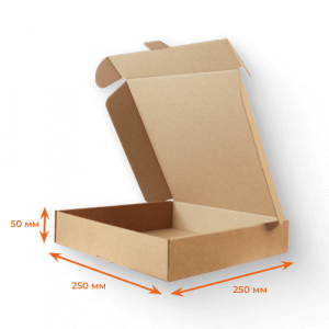 Короб с ушками 250х250х50 мм Т23Е бурого цвета. Эта самосборная коробка изготовлена из прочного картона Т23Е, обеспечивающего надежность и долговечность.