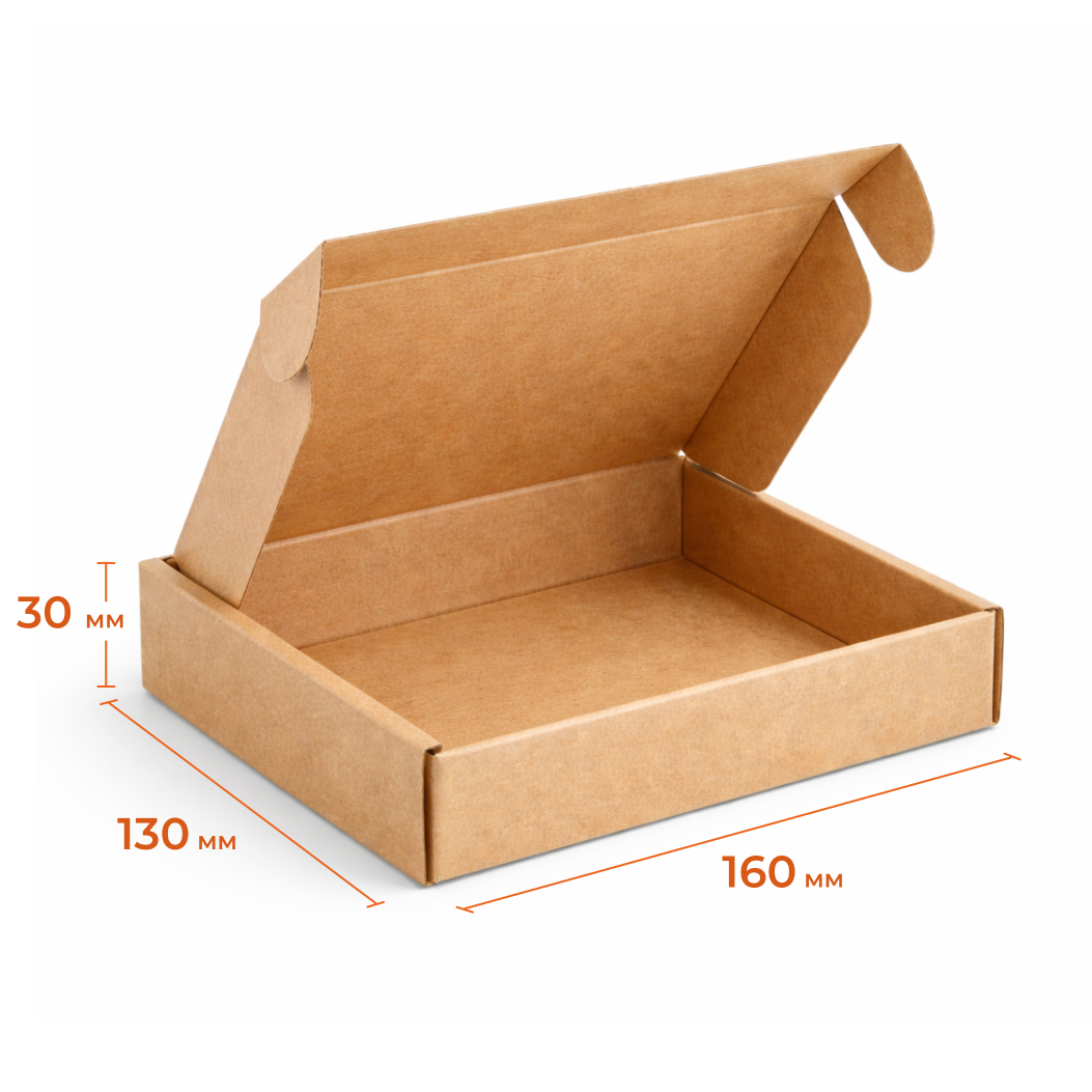 Картонная самосборная коробка 160х130х30 из гофрокартона Т23Е бурый — удобное решение для упаковки и отправки товаров. Конструкция коробки с замками-ушками позволяет быстро собрать упаковку без дополнительных материалов.