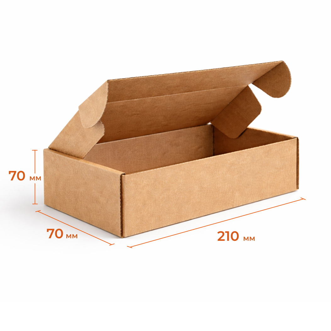 Самосборная коробка 210х70х70 мм изготовлена из гофрокартона Т23В и предназначена для упаковки, хранения и транспортировки товаров. Короб имеет удобную конструкцию с замками-ушками, благодаря которым быстро собирается без использования скотча.